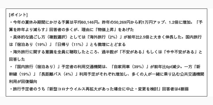 「ようやく夏休みが戻ってきたのかな」とデータを眺めて思いました。振り返れば年末・年始、お花見、さらにはGWと人の動きは堅調に回復に向かっていましたが、この夏休みも「昨年よりも予算を増やして帰省や旅行を!」という気運が高まっているようです。とは言え、海外旅行については回復途上とも言える状況で、その理由や背景も調査結果から垣間見られました。国内旅行は、コロナ禍で人気だった自家用車が減り、公共の交通機関へのシフトが確認できますが、一方でLCCや長距離バスの利用意向が増え、物価高による節約志向が映し出されていますね。「移動手段などは節約しつつホテルや旅先での食事やイベントは満喫したい」そうしたメリハリの利いた夏休みになりそうです。