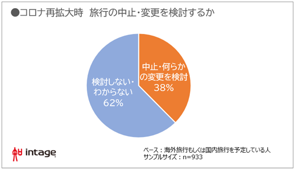 最後に、旅行を予定している人に、新型コロナウイルス再拡大が夏休み期間にあった場合、予定の中止や行き先・日程等の変更を検討するかどうかを確認しました。結果、全体の4割近くの人が「中止・何らかの変更を検討」と回答。この数字を多いと見るか少ないと見るかは難しいところですが、ポストコロナが進む中でも新型コロナウイルスがいまだ少なくない影響を生活者にもたらしていることがうかがえます(図表5)。