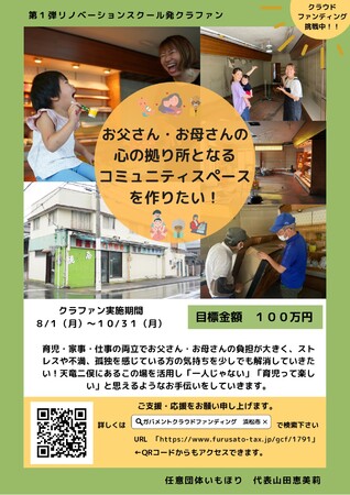 「みんなのアトリエいもほり」のプレオープン(11月)に向けた開業資金の募集。「みんなのアトリエいもほり」は、日々頑張っているお父さん・お母さんに少しでもゆとりをもってほしい、という想いで誕生する、自分らしさを磨ける場の提供や地域における心の拠り所となるようなコミュニティスペース。レンタルスペースやシェアスペースにおいて、お父さん・お母さんが自分のやりたいことに没頭できるほか、お父さん・お母さん同士の交流が生まれ、お父さん・お母さんのストレス解消につながる、相談相手を見つけることができる。