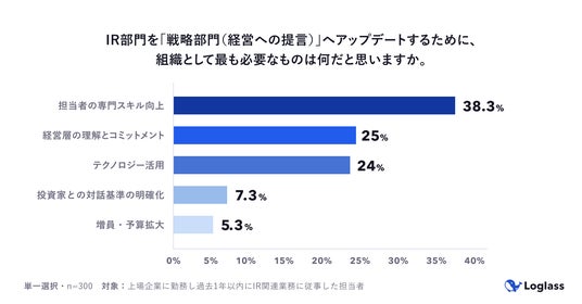 ・IR部門の戦略部門化に必要な要素としてスキル向上(38.3%)、経営層の理解(25.0%)、テクノロジー活用(24.0%)が挙げられた。増員・予算拡大に期待する声は5%台にとどまった。