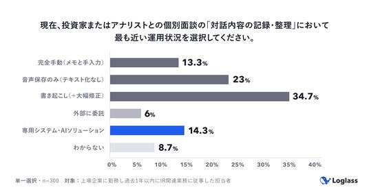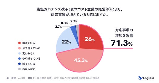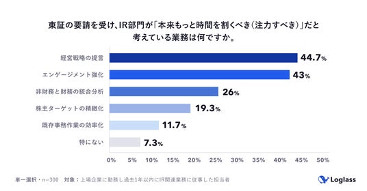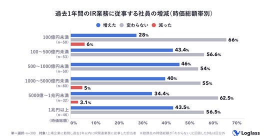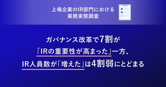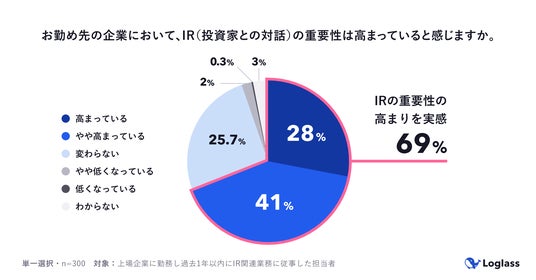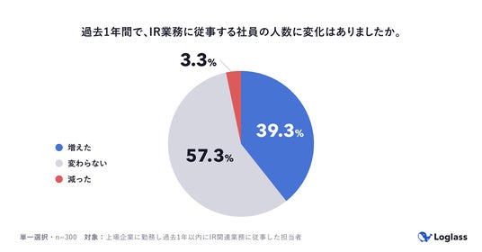 株式会社ログラス(本社:東京都港区、代表取締役 執行役員CEO:布川 友也、以下「当社」)は、上場企業でIR関連業務に関与する担当者300名を対象に「上場企業のIR部門における業務実態調査」を実施しました。