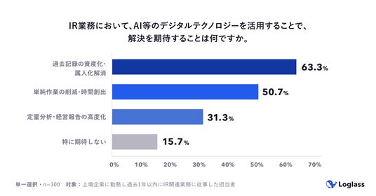 ・8割超のIR担当者が、AI・デジタルテクノロジーによる業務課題の解決を期待している。期待することとして、過去記録の資産化・属人化解消(63.3%)が最多。テクノロジーによる業務刷新への関心の高さを示した。