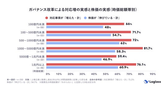 ガバナンス改革に伴い対応が増えたとの回答は7割を超す一方、株価が伸びているとの実感は50%前後にとどまる。負荷の重さと評価の実感は単純には連動しない。