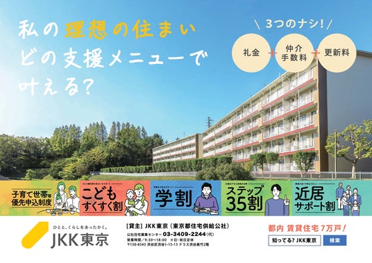 JKKは都内に約7万戸のJKK住宅(JKKが建設、管理する一般賃貸住宅)を提供しており、主に子育て世帯を対象とした住宅入居に係る支援メニューを紹介します。