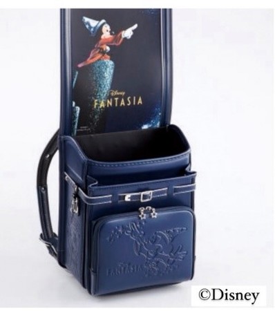ディズニー映画『ファンタジア』のランドセル。魔法使いの弟子として活躍するミッキーの表情を前段ポケットやマチに型押しで表現。かぶせ裏には魔法使いになった「ミッキー」が楽しめます。本体は映画のイメージカラーの