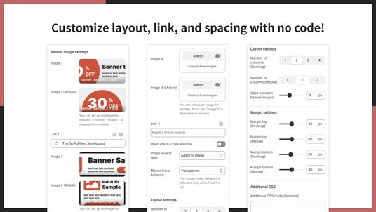 HTMLやCSSの知識がなくても、管理画面から見た目のカスタマイズが可能です。余白の調整や画像の切り替え、レイアウトの微調整など、直感的な操作でストアにマッチしたデザインを作成できます。誰でも簡単に導入・編集できるのが魅力です。