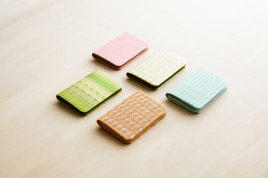 金、銀、漆箔などを貼って細く切った和紙をタテ糸にし、竹のヘラで拾いながら絹の細い糸を織りこみ、多種多様な模様を手仕事で織り上げます。