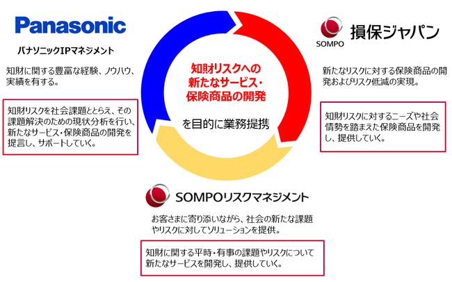 損害保険ジャパン株式会社(代表取締役社長:白川 儀一、以下「損保ジャパン」)、SOMPOリスクマネジメント株式会社(代表取締役社長:桜井 淳一、以下「SOMPOリスク」)およびパナソニックIPマネジメント株式会社(代表取締役社長:足立 和泰、以下「パナソニックIPマネジメント」)は、昨今の「コーポレートガバナンス・コード」の改訂や「知財・無形資産の投資・活用戦略の開示及びガバナンスに関するガイドライン」(略称:知財・無形資産ガバナンスガイドライン)策定など、知的財産(以下「知財」)を取り巻く環境が大きく変化するなか、世界に伍して戦っていく日本企業の将来価値・競争力の向上に貢献すべく、知財に関するリスク(以下「知財リスク」)への新たなサービス・保険商品の開発に向けて協業することに合意し、このたび業務提携契約を締結しました。