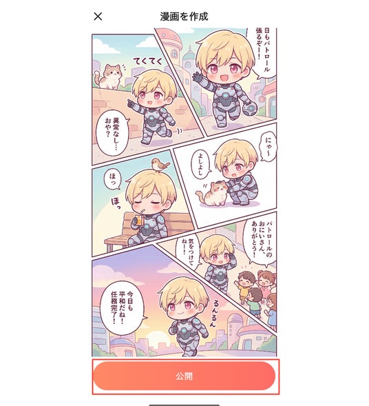 さらに、こちらは章ごとに構成されているため、チャット内容に合わせて継続的に更新しながら、自分だけのオリジナル漫画を作り上げることができます。1ページ完結ではなく、ストーリーがつながる連載形式の漫画として楽しめる点も特長です。