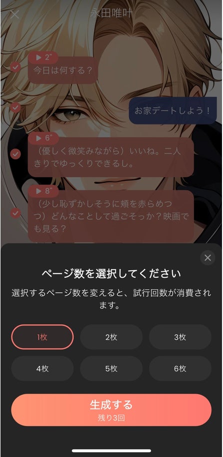 STEP3)漫画の枚数を1枚~6枚まで選択、自動でストーリを作成
