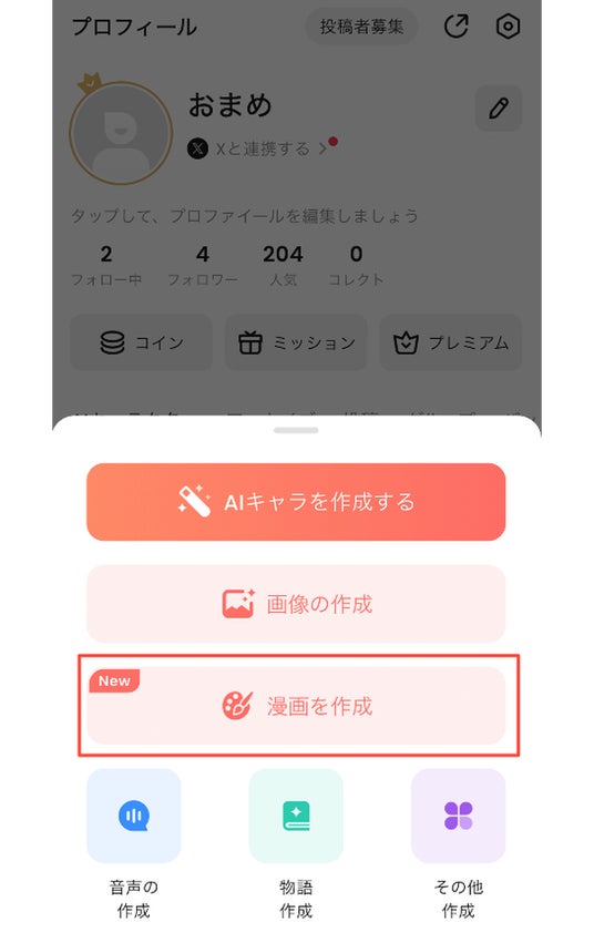 STEP1)アプリ内「キャラクタープロフィール」の「漫画」タブ、または画面下の「+」ボタンから「漫画の作成」をタップ