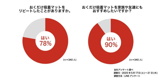 サンコー吸着マットは、生活・掃除用品で採用する当社の独自技術「おくだけ吸着(R)」素材をフルに採用しており、ペット用品においても高い吸着性を誇ります。走ってもズレない形状が特に支持された結果、実際にご使用いただいたお客様のアンケートでは、約78%の方がリピートしていると回答し、約90%の方がおすすめしたいと答えています。こうした声からも、安心・快適な暮らしを支えるペットケアアイテムとして、既存のお客様を中心にご好評いただいております。