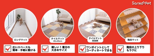 掃除・防災・ペット用品を中心に、生活サポート用品の商品開発から製造、販売までを一気通貫して提供する株式会社サンコー(本社:和歌山県海南市、代表取締役:角谷太基)は、ペットケアブランド「SankoPet」より、2021年度から2025年現在までの販売数100万個を誇るおくだけ吸着マット“滑らんワン”シリーズから「このコ想いのロングマット」(全3種)、「このコ想いのタイルマット45×45cm 8枚入」、「このコ想いのタイルマット肉球柄 2枚入」、「このコ想いの階段マット肉球柄 13枚入」を2025年8月1日(金)に新発売したことをお知らせします。