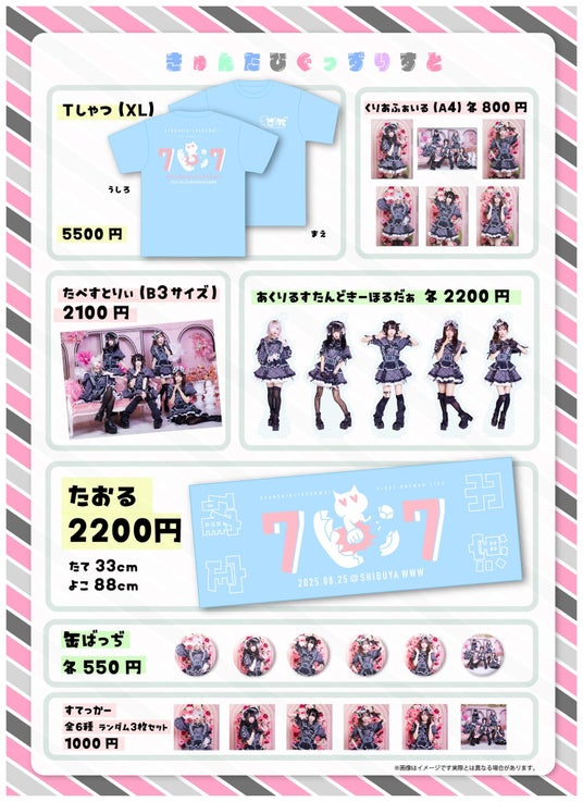 ワンマンライブに向けて展開している記念グッズも大きな反響を呼んでいます。タイトルの「確定演出」に因んだアイテムたちはワンマンをより楽しむために欠かせないでしょう。