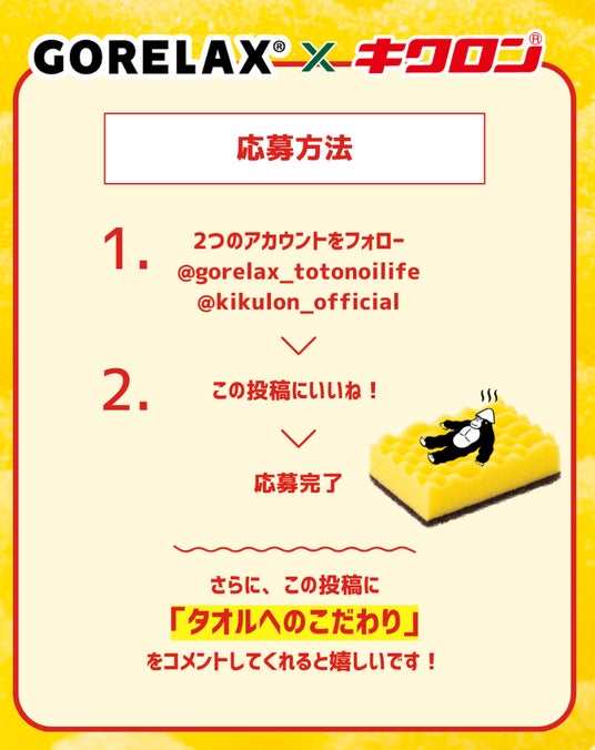 ごリラックスのアカウント(@gorelax_totonoilife)とキクロンのアカウント(@kikulon_official)をフォロー&投稿に「いいね」した方の中から抽選で、5名様にプレゼントいたします。