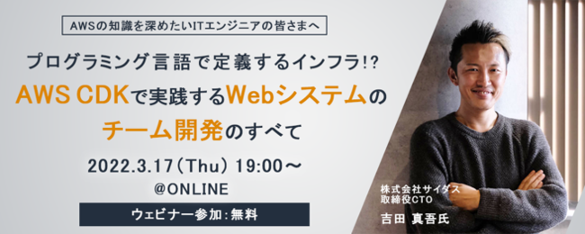 本セミナーでは、AWS Serverless Heroにて日本で初めて受賞された株式会社サイダス 取締役CTOの吉田 真吾氏を講師に迎え、今後チームで生産性を上げたい開発者に向けてAWS CDKの優れた使い方を一式学んでいきます。具体的には、ガバナンスの効いたAWSアカウント構成やContextを利用した便利なステージごとの環境構成、アプリケーションパターンごとのプロジェクト(リポジトリ)構成から、実際のアプリケーションコード、ログやパフォーマンス監視の方法、CDK Watchによるローカル体験といった、 Webシステムのチーム開発をAWS CDK v2をベースに行う際に必要なノウハウを一式お伝えいたします。