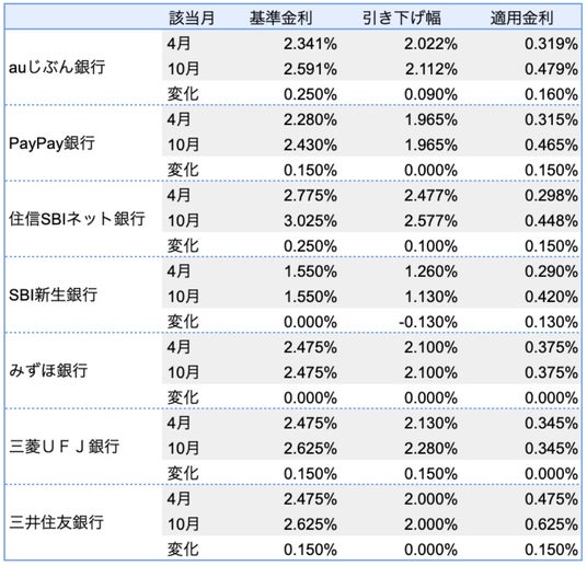 10月は短プラ引き上げで数多くの金融機関の住宅ローン基準金利が約0.15%上昇しました。その結果、同じように適用金利も上昇しました。一方、一部金融機関では住宅ローン基準金利を据え置いたり、基準金利を引き上げるものの引き下げ幅を拡大して適用金利を据え置く動きもあります。主要なネット銀行とメガバンクの動きについて表にまとめました。