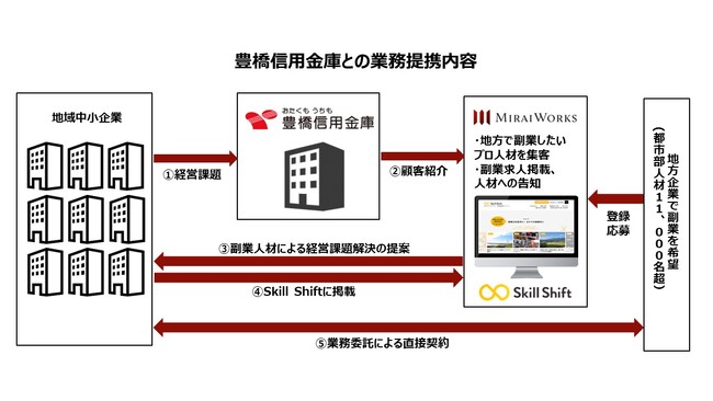 プロフェッショナル人材のフリーランス・副業といった多様な働き方をサポートする株式会社みらいワークス(本社:東京都港区、代表取締役社長:岡本祥治、証券コード:6563、以下「当社」)は、豊橋信用金庫(本店:愛知県豊橋市、理事長:山口進、以下「とよしん」)と人材支援による地域企業の事業強化を目的とした業務提携契約を締結したことをお知らせいたします。また、今回のとよしんとの提携をもって、95の地域金融機関と地方転職・副業人材の活用を推進することとなります。
