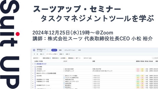 株式会社スーツ(所在地:東京都千代田区、代表取締役社長CEO:小松 裕介)は、2024年12月25日(水)19時から、当社代表の小松が講師を務めるスーツアップ・セミナー「タスクマネジメントツールを学ぶ」を無料開催します。