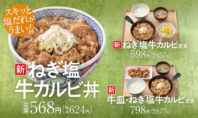 『ねぎ塩牛カルビ丼(並盛)』568円(税込624円)は特製のねぎ塩だれとカルビ肉を一緒に香ばしく焼き上げ、ご飯の上に盛り付けた商品です。吉野家特製のねぎ塩だれは刻み玉ねぎに、塩、ガーリック、胡麻油、りんご酢、塩麹を加え風味豊かな味わいに仕上げています。また、ご飯、みそ汁、サラダを定食仕立てで提供する『ねぎ塩牛カルビ定食』598円(税込657円)に加え、ご飯、みそ汁、牛皿とボリューム満点の『牛皿・ねぎ塩牛カルビ定食』798円(税込877円)も販売を開始します。定食はご飯増量、おかわり無料です。