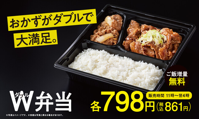 『W(ダブル)弁当』は「牛皿・牛カルビ」、「牛皿・ねぎ塩牛カルビ」、「牛皿・ねぎ塩豚」、「牛皿・から揚げ」の合計4種類です。価格はいずれも 798 円(税込861円)で、ご飯増量が無料です。