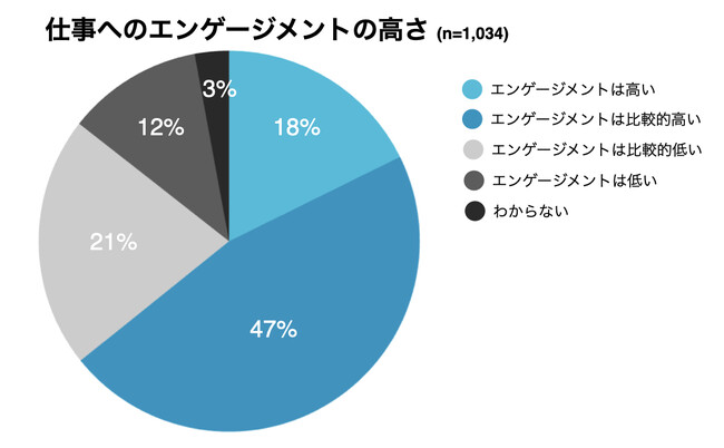 今の仕事に対するエンゲージメントについて聞いたところ「高い(18%)」、「比較的高い(47%)」、「比較的低い(21%)」、「低い(12%)」、「わからない(3%)」という回答結果となりました。