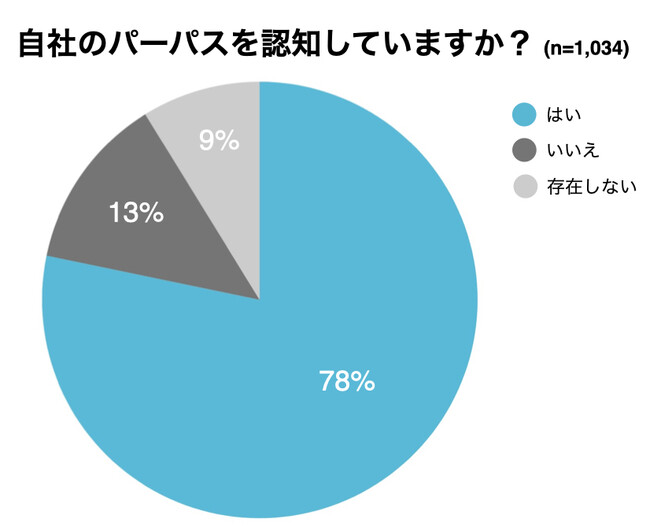 78%が自社のパーパスを認知・共感しているという結果。転職時にパーパス共感を重視する人は増加傾向に
