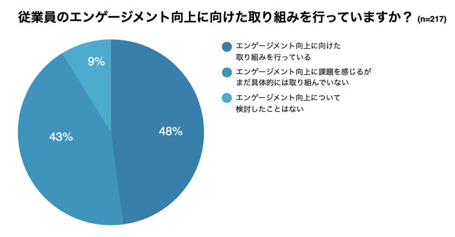 従業員のエンゲージメント向上に向けた取り組みを行っているか聞いたところ、「行っている(48%)」、「課題を感じるが取り組んでいない(43%)」、「検討したことはない(9%)」という回答結果に。エンゲージメント向上に向けた取り組みをしていない企業(課題を感じるが取り組んでいない+検討したことはない)は52%となり、大半の企業が課題を抱えているという結果に。