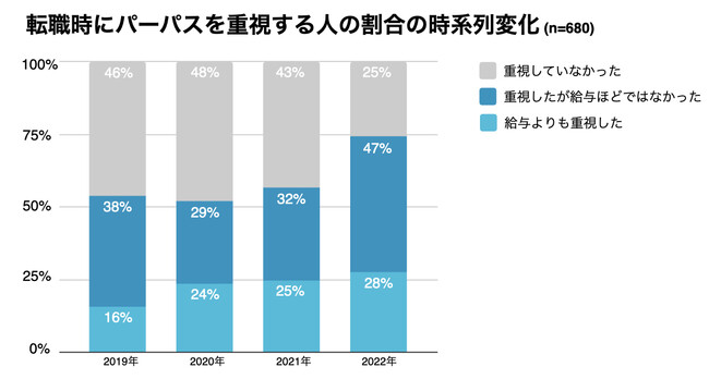 転職時にパーパスを重視する人は増加傾向にあり、2022年の調査結果では、重視している人の割合(給与よりも重視した+重視したが給与ほどではなかった)は75%という結果に。またパーパスを「給与よりも重視した」人の割合は、2019年から2022年の3年間で1.75倍に。