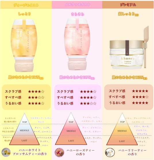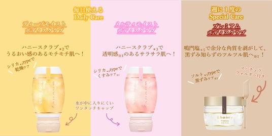 従来のボディスクラブにおいて「刺激が強い」「乾燥する」「洗い流しにくい」など、改善すべき課題がありました。この課題を解決するため、アンドハニーの強みである「高い保湿力」と「ハチミツ*1の保水力」を掛け合わせ、「肌に優しく、洗い上がりしっとり潤う」新しいボディスクラブがこの度、誕生しました。