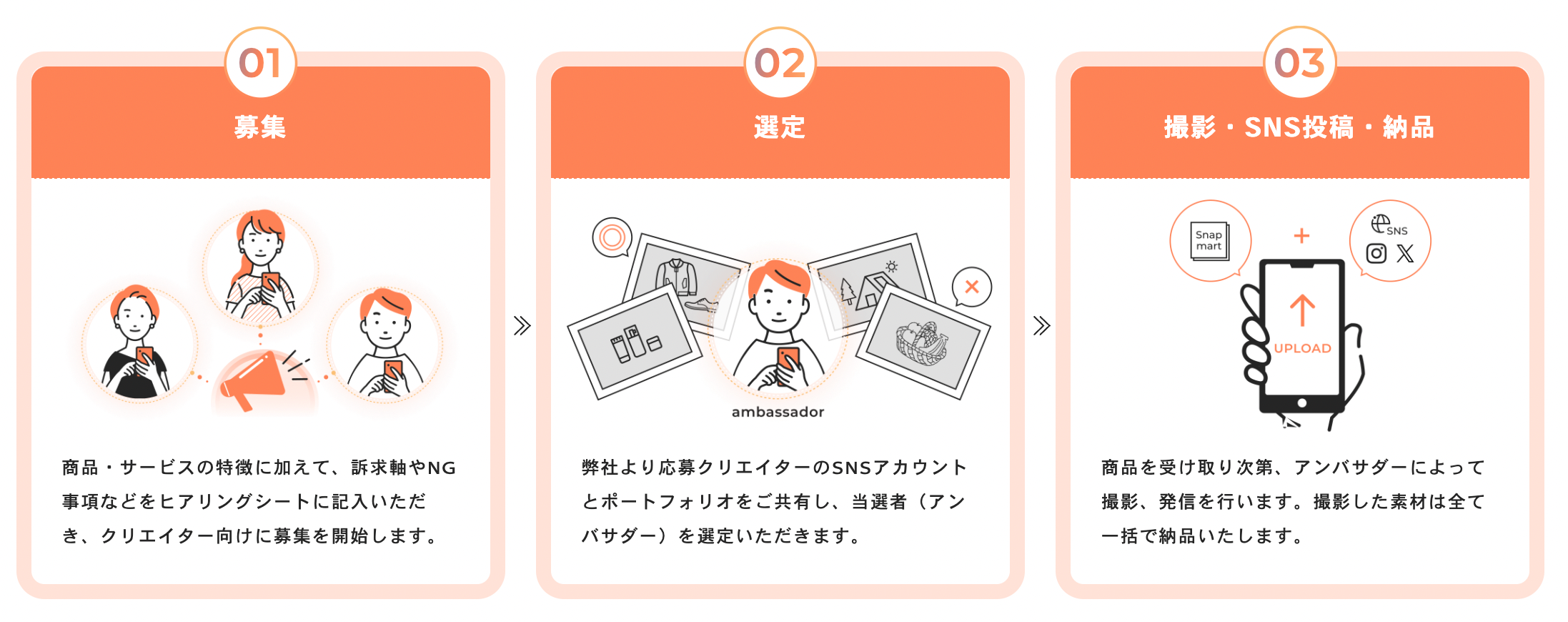 アンバサダープランとは、商品やサービスの撮影・発信を行うアンバサダーを募集し、企業独自の口コミ(SNS投稿)と撮影素材の大量収集を同時に実現するプランです。熱量が高く、リアルな視点での口コミは、SNS上でユーザーの共感を呼ぶことに繋がりファン層の拡大と育成に貢献します。納品した写真や動画、口コミ(SNS投稿)は、媒体不問で無期限に二次利用可能。SNS投稿や広告、Webサイトにご利用いただけます。