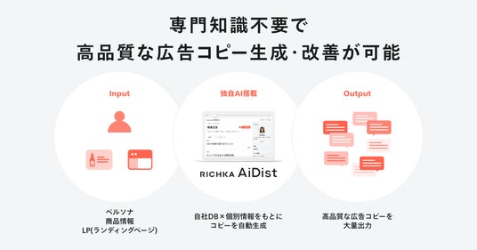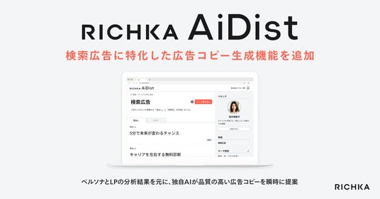 株式会社リチカ(本社:東京都渋谷区 / 代表取締役:松尾幸治 / 以下、当社)は、AIマーケティング・アシスタント「RICHKA AiDist(リチカ アイディスト)」の新機能として、検索広告に最適化した広告コピー生成機能の提供を開始しました。本機能を活用することで、Google広告、Yahoo!広告などの広告コピーを、ペルソナ×LPごとに大量生成することが可能です。