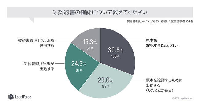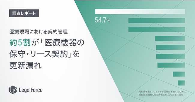 AI契約審査プラットフォーム「LegalForce」、AI契約管理システム「LegalForceキャビネ」を提供する株式会社LegalForce(本社:東京都江東区 代表取締役:角田望、以下LegalForce)は、契約書を扱ったことがあると回答した医療従事者334名を対象に、医療現場における契約管理実態調査を実施いたしました。