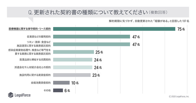 ・「解約期限に気づかず、更新された」契約書の種類で最も多かったのは、「医療機器に関する保守契約・リース契約」で54.7%