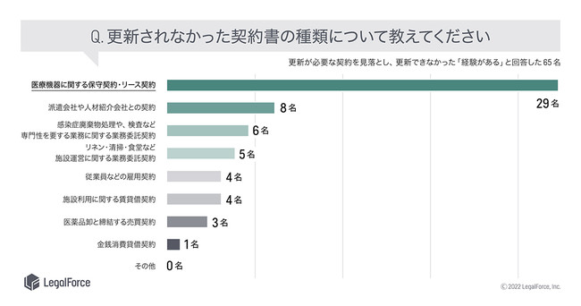 ・更新されなかった契約書の種類について、44.5%(29名)が「医療機器に関する保守契約・リース契約」と回答