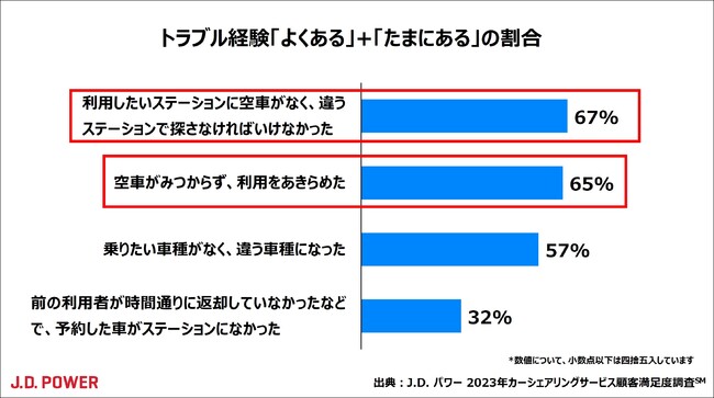 顧客満足度の一層の向上のために、カーシェア利用時におけるネガティブ体験を減少させることが重要である。本調査では、カーシェア利用時に何らかのトラブルを経験している人の割合は83%と依然として8割を超えていることが確認できた。具体的に普段のカーシェア利用におけるトラブル体験を聞くと、「利用したいステーションに空車がなく、違うステーションで探さなければいけなかった」、「空車がみつからず、利用をあきらめた」といった空車不足によるトラブルを約3分の2のユーザーが体験していることがわかった。