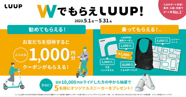 株式会社Luup(本社:東京都千代田区、代表取締役社長兼CEO:岡井大輝、以下「Luup」)は、電動マイクロモビリティのシェアリングサービス「LUUP」のポート数が3,000を突破したことと、東京/大阪/京都でのポート数がNo.1(※1)になったことを記念した「WでもらえLUUP」キャンペーンを、2023年5月1日(月)~5月31日(水)まで開催します。