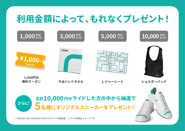 ・合計乗車金額10,000円分ライドした方の中から抽選で5名様にLUUPオリジナルスニーカーをプレゼント