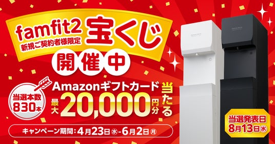 キャンペーン期間中に「famfit2」を新規でご契約された方限定で、抽選で最大830名様に最大2万円分のAmazonギフトカードが当たる、宝くじキャンペーンを実施します。(famfit2のご契約完了で自動的にエントリー完了となります。)また惜しくも外れてしまった方には、「Amazonギフトカード500円分」が500名様に当たる「Wチャンス賞」もご用意しております。