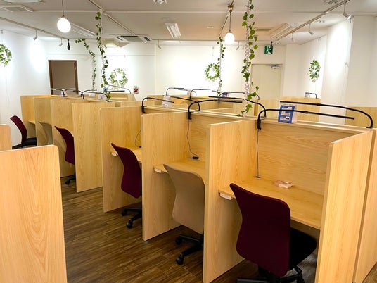 天井が高く、広々した店内。座席数は28席で、全席ブース型のため集中して勉強・仕事ができる環境です。