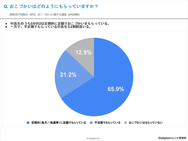 ・中高生のうち3分の2は定期的に定額でおこづかいをもらっていると回答。