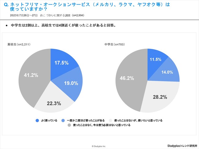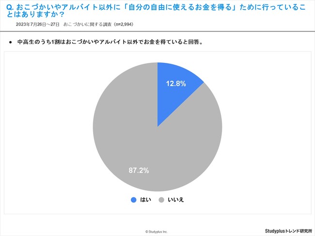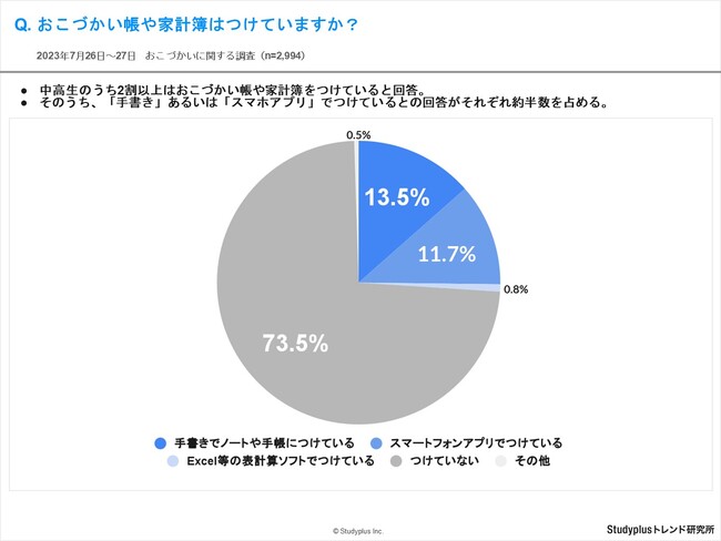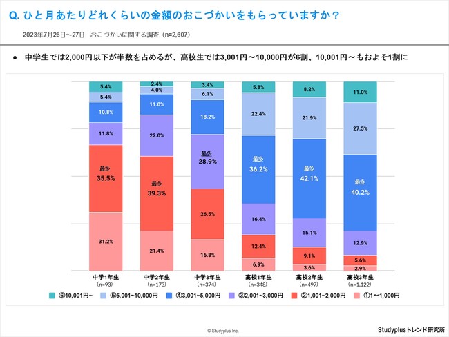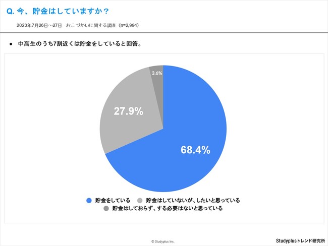 スタディプラス株式会社(本社:東京都千代田区、代表取締役:廣瀬高志、以下スタディプラス)のStudyplusトレンド研究所は、2023年7月26日(水)から7月27日(木)にかけて学習管理アプリ「Studyplus」上で全国の中学1年生から高校3年生を対象に、「おこづかいに関する調査」を実施、2,994名から回答を得ましたのでご報告いたします。