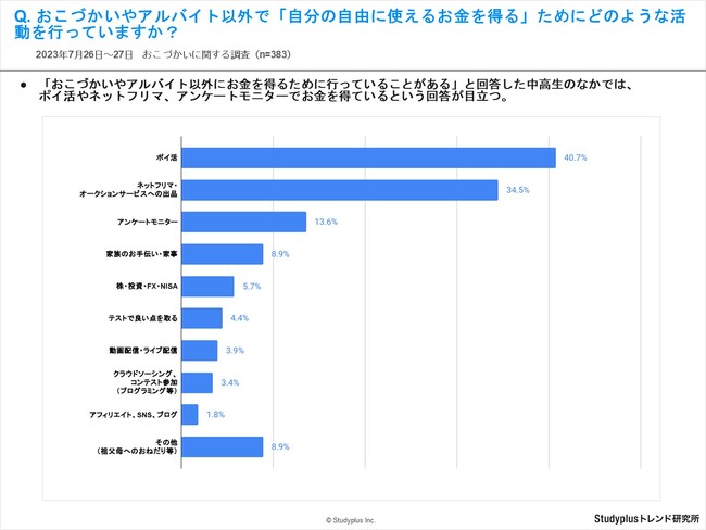 ・「おこづかいやアルバイト以外にお金を得るために行っていることがある」と回答した中高生の中では、ポイ活やネットフリマ、アンケートモニターでお金を得ているという回答が目立つ。