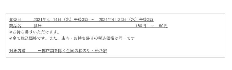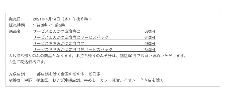 株式会社松屋フーズ(本社:東京都武蔵野市、代表取締役社長:瓦葺 一利)では、とんかつ専門店の「松のや・松乃家」におきまして、2021年4月14日(水)午後3時より「ヤバい夜弁当」「豚汁半額」キャンペーンを開催いたします。また「厚切りローストッピング無料」キャンペーンを1週間延長し4月21日(水)まで開催いたします。
