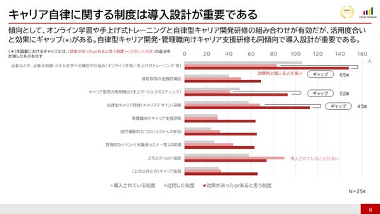 ・オンライン学習や手上げ式トレーニングが効果的と感じる人が多いが、実際には上司との1on1がキャリア自律制度として多く利用されている。