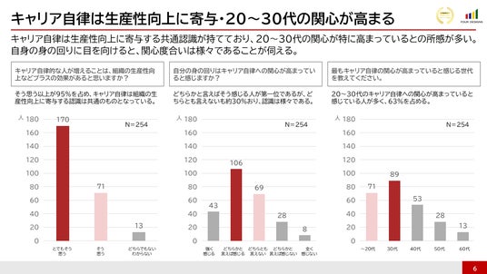 ・キャリア自律は組織の生産性向上に寄与し、特に20~30代の若い世代からの関心が増加しているとの声が過半数。若手のキャリア自律を支援することは、従業員満足度向上につながる可能性を示唆。