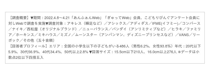 園児とママ・パパの情報誌「あんふぁん」「ぎゅって」を発行する株式会社こどもりびんぐ(所在地:東京都千代田区、代表取締役:中島一弘)では「シルミル研究所」としてリサーチ事業を展開しています。「シルミル研究所」では、全国のママ、パパを対象にしたリサーチ事業「こどもリサーチ」を実施し、Webコンテンツとして発信しています。第36回目となる調査テーマは、全国のママ・パパが選ぶ「子どものスニーカー」について。小学生以下の子を持つ人を対象に、持っている靴のサイズを15.5cm以下と16.0cm以上の部門に分け、利用率や満足度を聞きました。