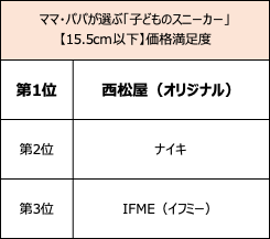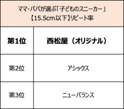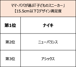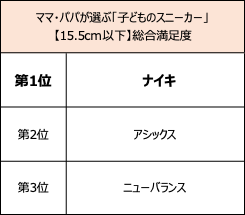 15.5cm以下部門の利用率1位は「ニューバランス」 。リピート率、価格満足度1位は「西松屋(オリジナルブランド)」、デザイン満足度1位、総合満足度1位は「ナイキ」となりました。