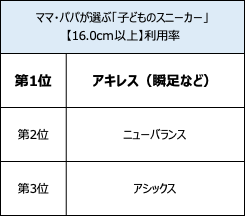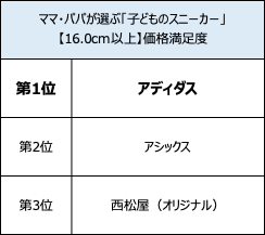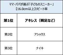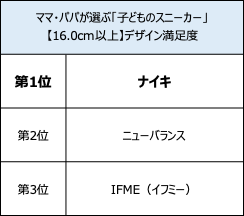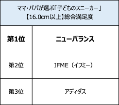 一方、16.0cm以上部門は、「瞬足」シリーズを展開する「アキレス」が利用率、リピート率ともに1位と支持が集まりました。アキレスの利用率1位は、2年連続。価格満足度1位は「アディダス」、デザイン満足度1位は「ナイキ」、総合満足度1位は「ニューバランス」となりました。