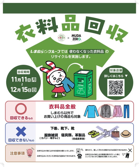 株式会社しまむら(本社所在地:埼玉県さいたま市大宮区北袋町1-602-1、代表取締役:鈴木 誠)は、11月11日(月)から12月15日(日)まで、衣料品回収をしまむらグループ200店舗で実施します。 店舗で回収した衣料品は、株式会社カイタックファミリーの「MUDAZERO」プロジェクトを通じて服から服へのリサイクルを行います。
